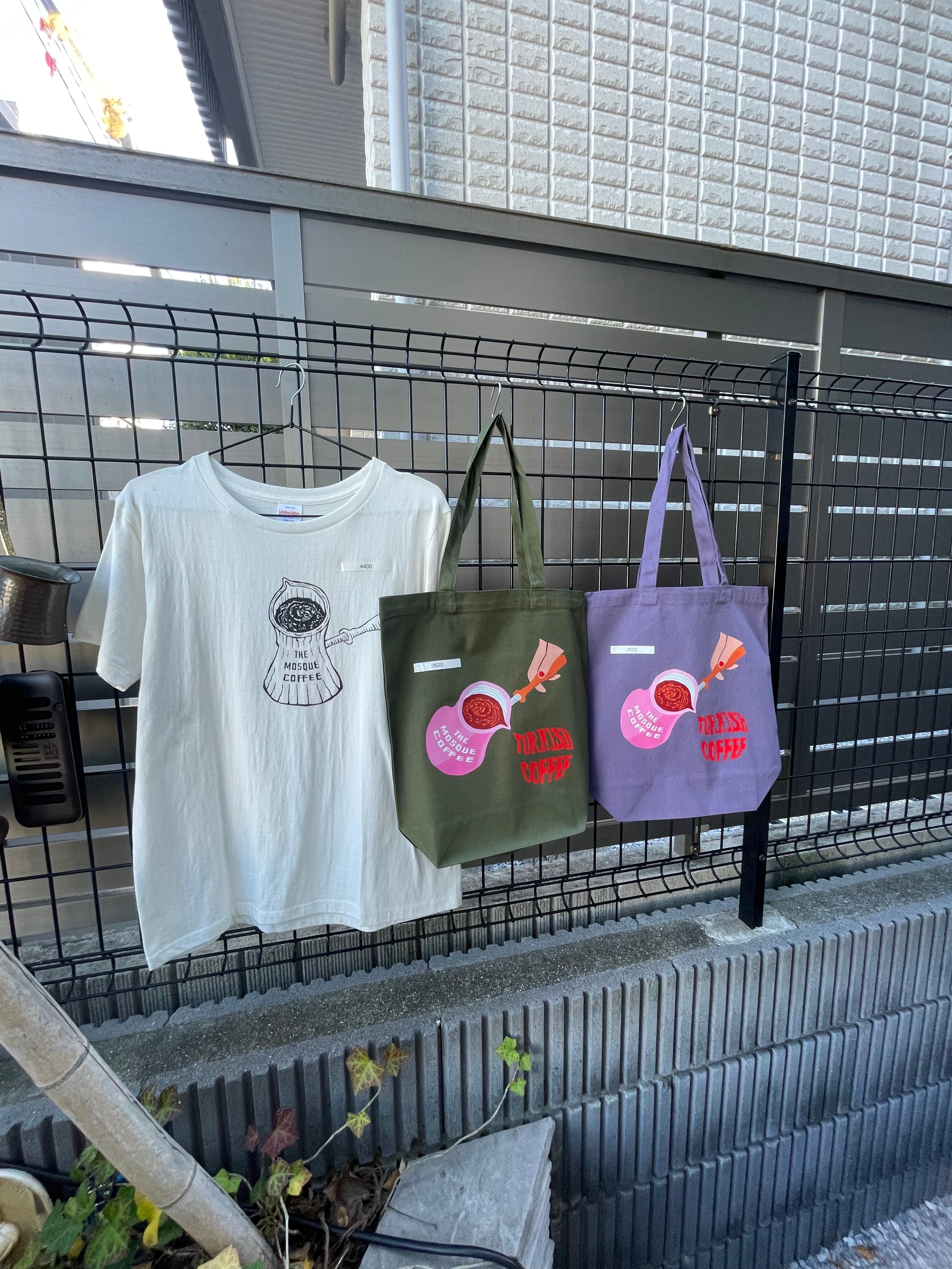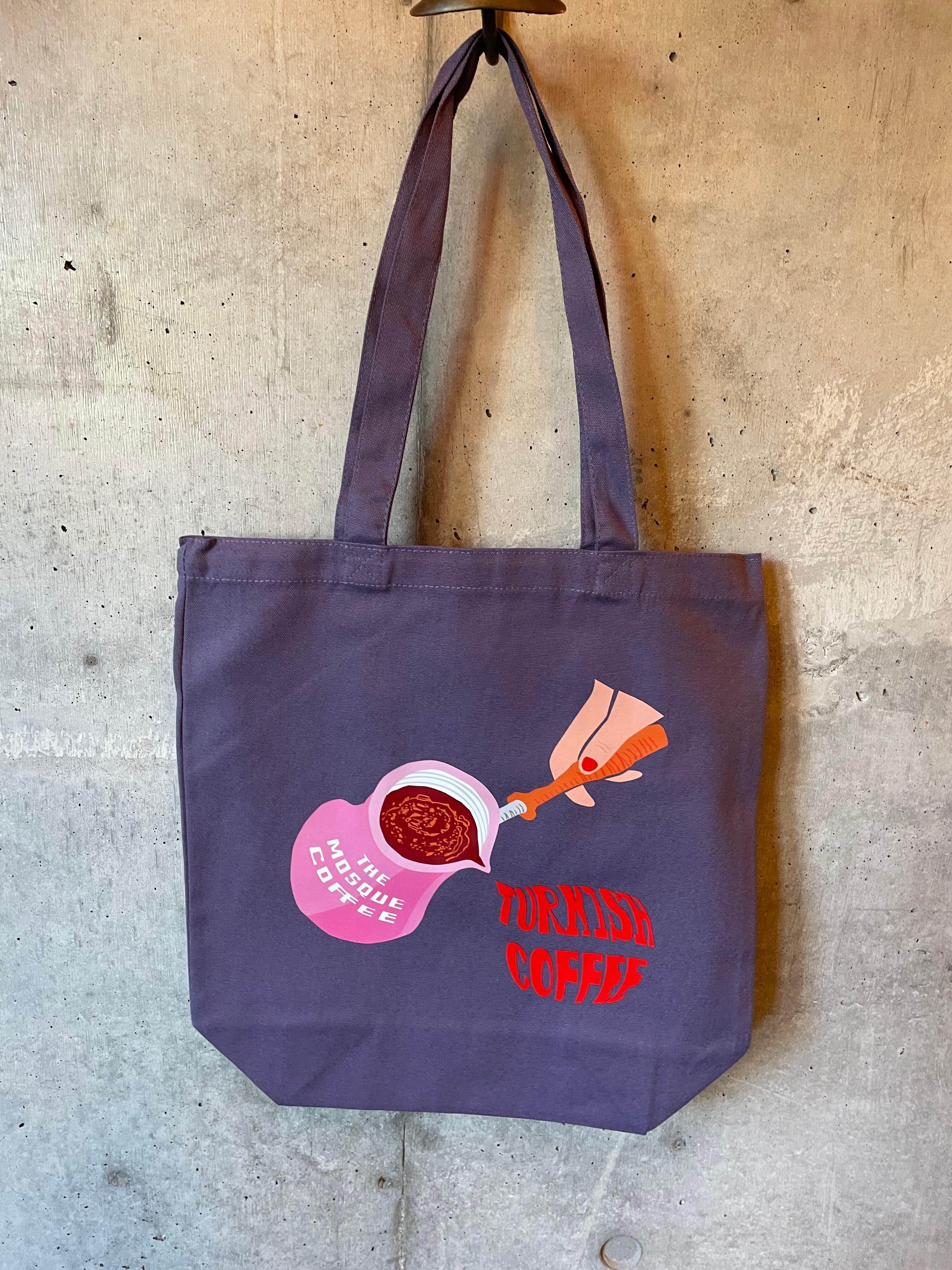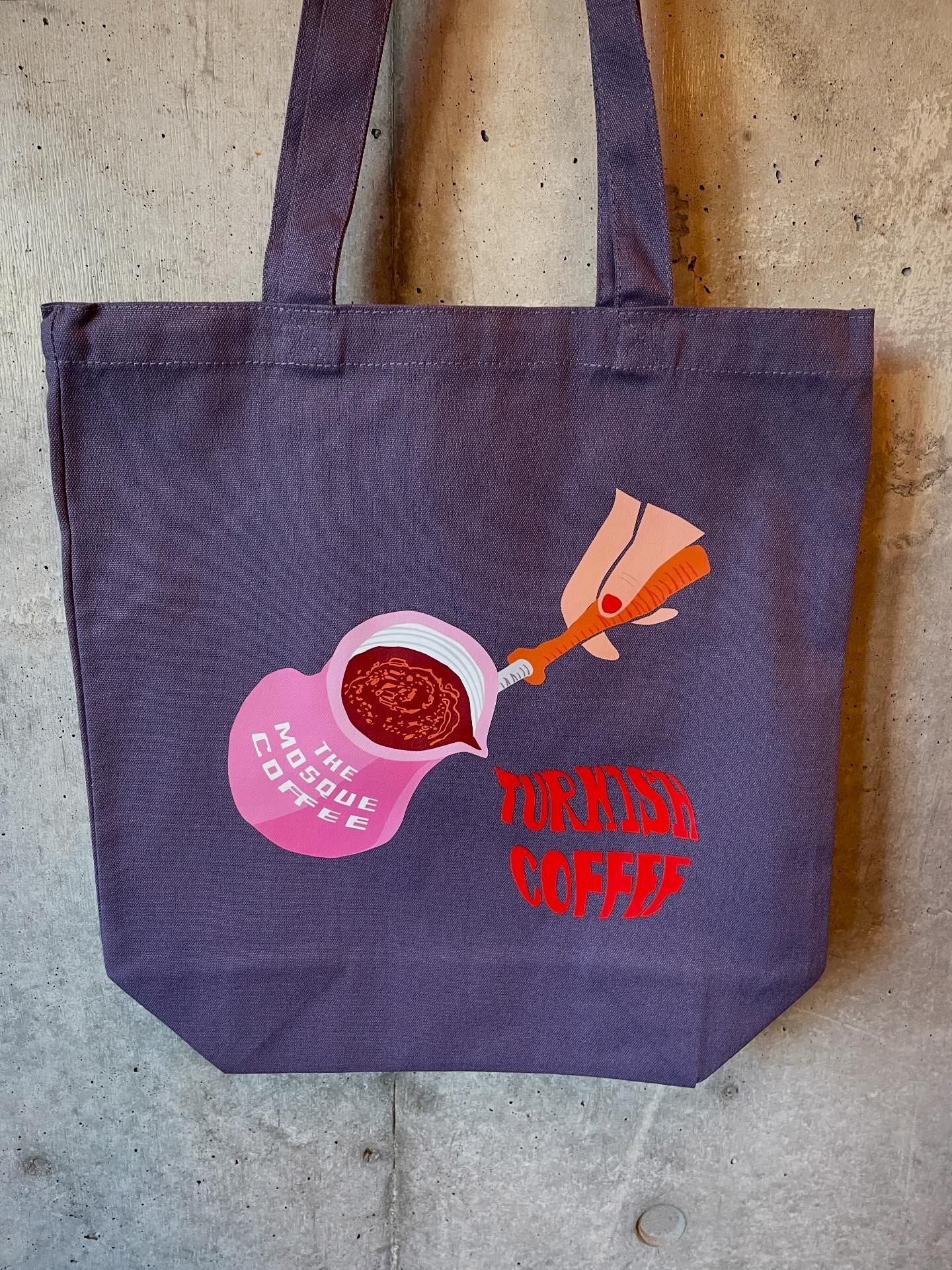 パープルのバッグにトルココーヒーを注ぐイラストです。