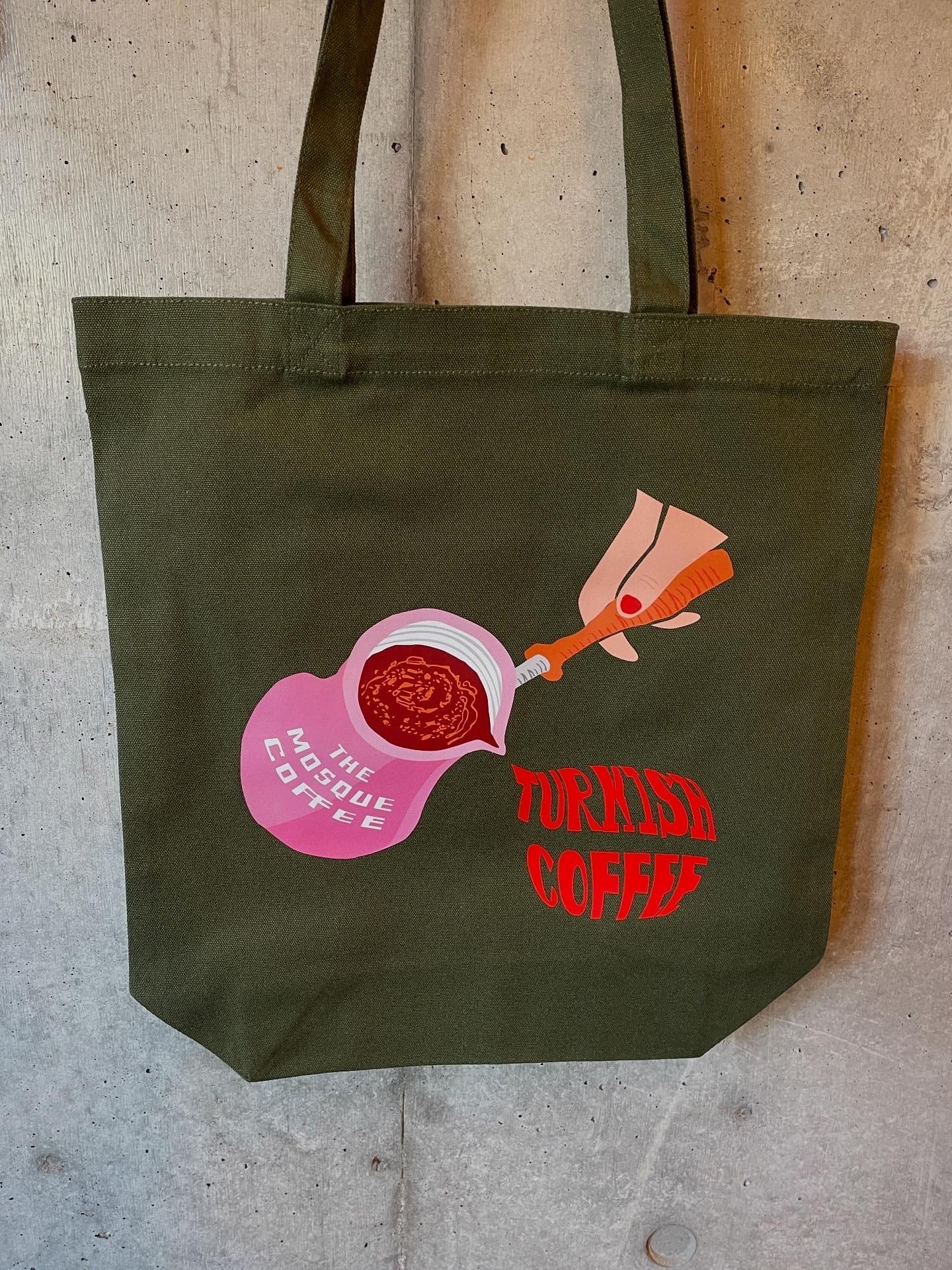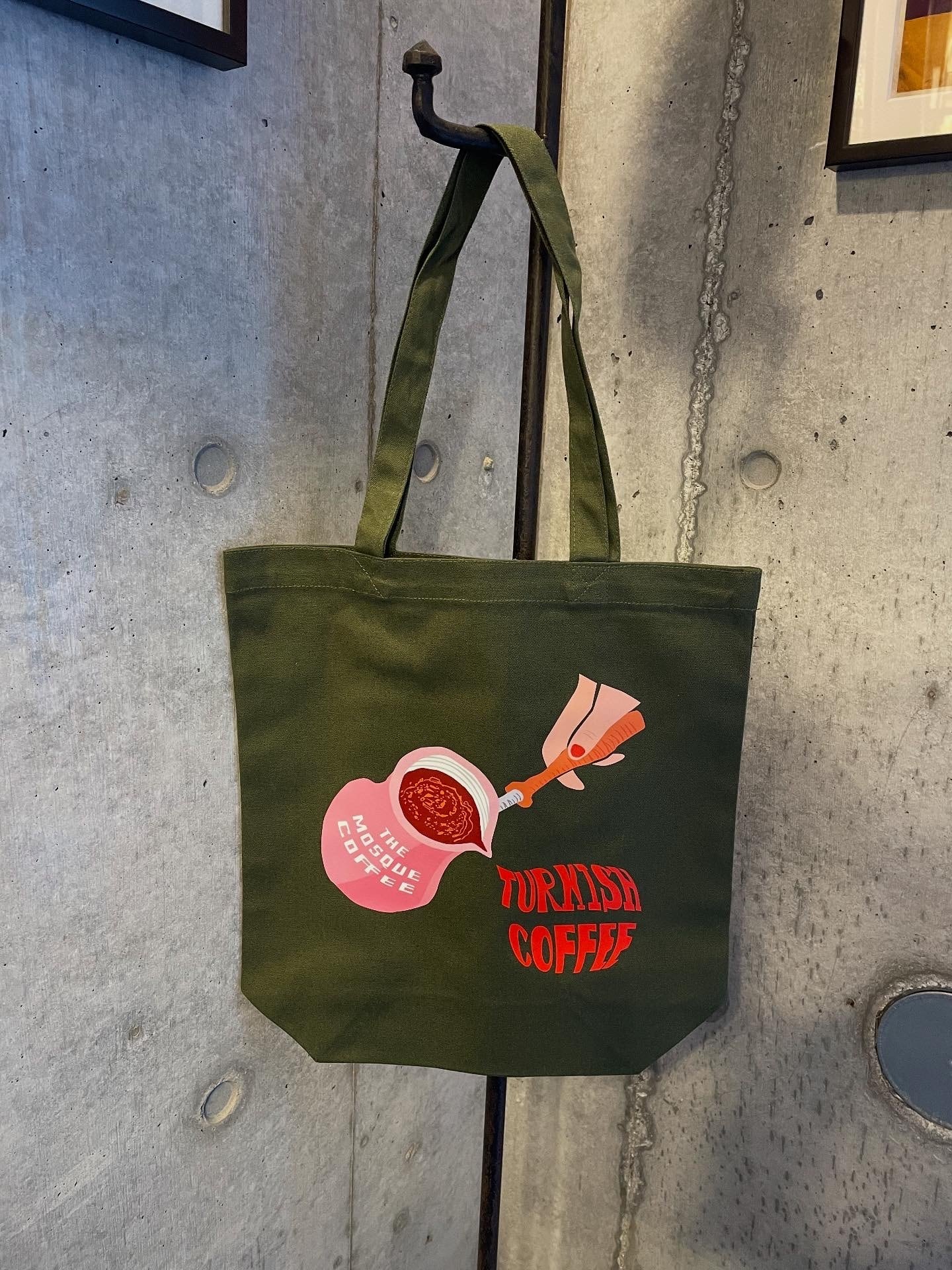 オリーブカラーのバッグにトルココーヒーを注ぐイラストです。